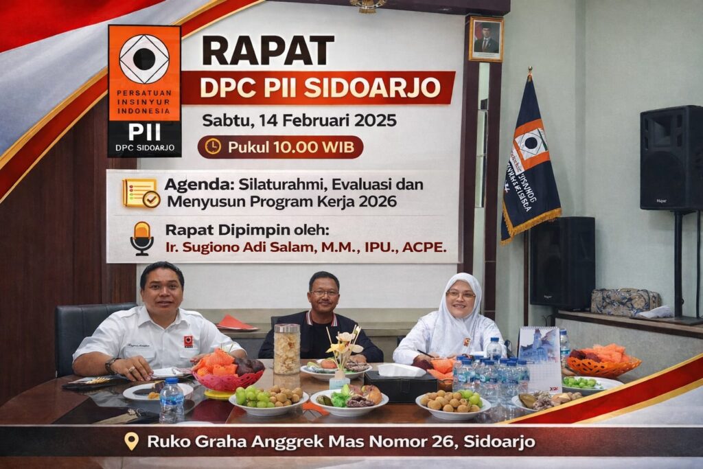 SIDOARJO – Pengurus Cabang (PC) Persatuan Insinyur Indonesia (PII) Kabupaten Sidoarjo menggelar rapat silaturahmi dan evaluasi program kerja, Sabtu (14/2/2025), pukul 10.00 WIB sd selesai.
